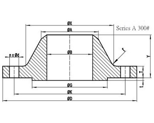 ASME B16.47 Series A Flanges Class 300 Dimensions and Technical Drawings ASME B16.47 Series A 300# Welding Neck Flange with RF ASME B16.47 Series A Class 300 Blind Flange with RF DOWNLOAD ASME B16.47 SERIES A FLANGES CLASS 300 DIMENSIONS AND TECHNICAL DRAWINGS PDF Get Complete details of ANSI/ASME B16.47 Standard Flange 300# B16.47 Series A Flanges Dimensions B16.47 Dimensions in MM NPS D K G X 26" 970 876.3 749 721 28" 1035 939.8 800 775 30" 1090 997.0 857 827 32" 1150 1054.1 914 881 34" 1205 1104.9 965 937 36" 1270 1168.4 1022 991 38" 1170 1092.2 1029 994 40" 1240 1155.7 1086 1048 42" 1290 1206.5 1137 1099 44" 1355 1263.6 1194 1149 46" 1415 1320.8 1245 1203 48" 1465 1371.6 1302 1254 50" 1530 1428.8 1359 1305 52" 1580 1479.6 1410 1356 54" 1660 1549.4 1467 1410 56" 1710 1600.2 1518 1464 58" 1760 1651.0 1575 1514 60" 1810 1701.8 1626 1565 General Note: All dimensions are in MM. D: outside diameter of flange. K: diameter of bolt circle. G: diameter of raised face. X: diameter of hub of flange. NPS A TBL TWN Y 26" 660.4 82.6 77.8 183 28" 711.2 88.9 84.2 195 30" 762.0 93.7 90.5 208 32" 812.8 98.5 96.9 221 34" 863.6 103.2 100.1 230 36" 914.4 109.6 103.2 240 38" 965.2 106.4 106.4 179 40" 1016.0 112.8 112.8 192 42" 1066.8 117.5 117.5 198 44" 1117.6 122.3 122.3 205 46" 1168.4 127.0 127.0 214 48" 1219.2 131.8 131.8 222 50" 1270.0 138.2 138.2 230 52" 1320.8 142.9 142.9 237 54" 1371.6 150.9 150.9 251 56" 1422.4 152.4 152.4 259 58" 1473.2 157.2 157.2 265 60" 1524.0 162.0 162.0 271 General Note: All dimensions are in MM. A: Diameter of hub top of WN. TBL: minimum thickness of blind flange….