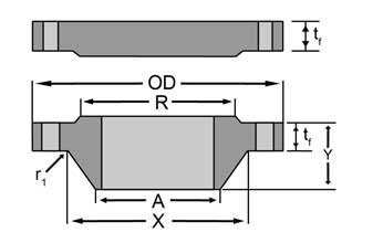 ASME B16.47 Series B Class 900 Flange Dimensions DOWNLOAD ASME B16.47 SERIES B CLASS 900 FLANGE DIMENSIONS PDF Get Complete details of Series B Flange Nominal Size Outside Diameter (OD) Min. Thickness [Note1] – WNF (tf) Min. Thickness [Note1] – Blind (tf) Length Through Hub (Y) Hub Dia. Base [Note2] (X) Hub Dia. Top (A) Raised Face Dia. (R) Drilling – Bolt Circle Dia. Drilling – No. of Bolt Holes Drilling – Dia. of Bolt Hole Dia. of Bolt Min. Fillet Radius (r1) 26 40.25 5.31 6.06 10.19 29.25 26.00 30.00 35.50 20 25⁄8 21⁄2 0.44 28 43.50 5.81 6.56 10.88 31.38 28.00 32.25 38.25 20 27⁄8 23⁄4 0.50 30 46.50 6.12 6.93 11.38 33.50 30.00 34.50 40.75 20 31⁄8 3 0.50 32 48.75 6.31 7.31 11.94 35.75 32.00 36.50 43.00 20 31⁄8 3 0.50 34 51.75 6.75 7.68 12.56 37.88 34.00 39.00 45.50 20 33⁄8 31⁄4 0.56 36 53.00 6.81 7.94 12.81 40.00 36.00 40.50 47.25 24 31⁄8 3 0.56 38 57.50 7.50 8.50 13.88 42.25 38.00 43.25 50.75 20 35⁄8 31⁄2 0.75 40 59.50 7.75 8.81 14.31 44.38 40.00 45.75 52.75 24 35⁄8 31⁄2 0.81 42 61.50 8.12 9.12 14.62 46.31 42.00 47.75 54.75 24 35⁄8 31⁄2 0.81 44 64.88 8.44 9.56 15.38 48.62 44.00 50.00 57.62 24 37⁄8 33⁄4 0.88 46 68.25 8.88 10.06 16.18 50.88 46.00 52.50 60.50 24 41⁄8 4 0.88 48 70.25 9.19 10.38 16.50 52.88 48.00 54.50 62.50 24 41⁄8 4 0.94 ASME B16.47 Series B Class 900 Flange Industries and Applications Widely used in the industries Pumps, Valves, and vessels in manufacturing and food processing. Pipe connections in industrial waterworks. Heat exchangers and heating systems of all sizes. Mining support. Nuclear power systems. Plumbing and mechanical systems. Assemblies in the oil, gas, and petrochemical industries. Fire protection systems. ASME B16.47 Series B…